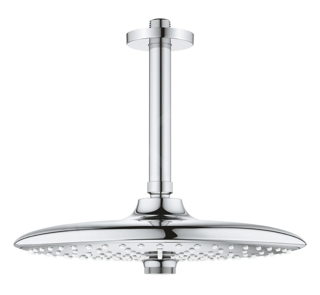 Verschaf uw badkamer een kwaliteitsaccessoire in de vorm van de GROHE Euphoria 260 SmartControl hoofddouche, met een imposante douchekop van 260 mm en drie soorten stralen voor perfect doucheplezier. Daarbij hoeft u om de straal te veranderen slechts aan het innovatieve wieltje in het midden van de douchekop te draaien. Heel eenvoudig. Dankzij het slanke profiel en het tijdloze design past de douche fantastisch in badkamers in allerlei stijlen, terwijl hij vol zit met geavanceerde GROHE technologie. De set bevat een 142 mm lange douchearm, waarvan de installatie erg eenvoudig is. De WaterGuide verdeler verhindert dat het buitenoppervlak van de douche te heet wordt, waardoor niet alleen uw gevoelige huid, maar ook het verchroomde oppervlak beschermd wordt. GROHE Euphoria 260 SmartControl – alles voor ontspanning en puur doucheplezier.